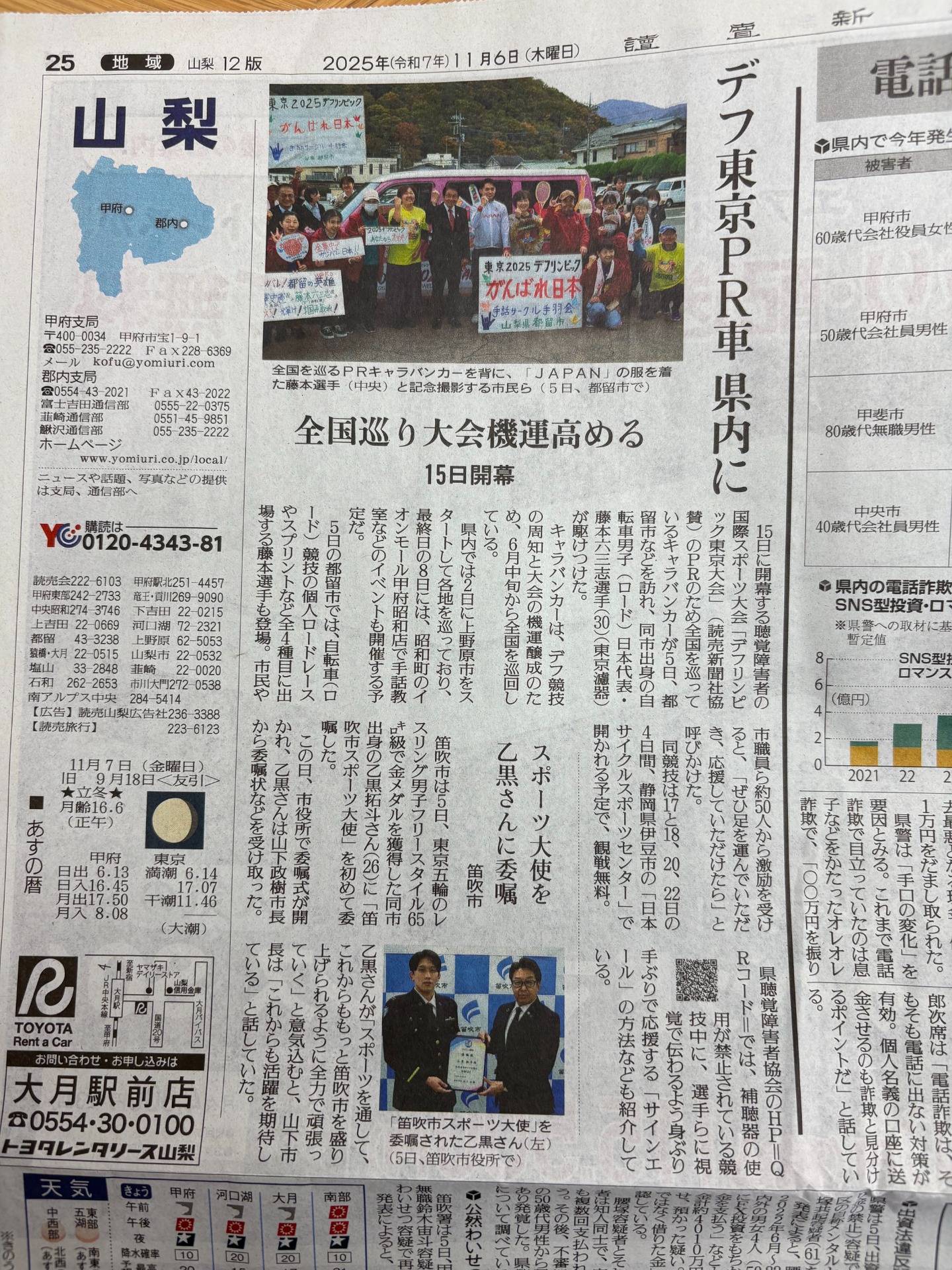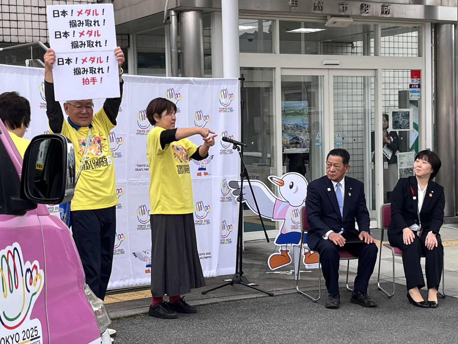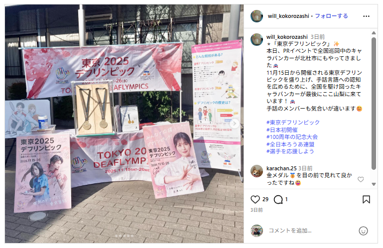 デフリンピックの開催まで残りわずかとなる中、この機運を高めるために、「東京2025デフリンピック」全国キャラバンカーによる機運醸成活動が上野原市から昭和町まで17か所の会場で行われました。