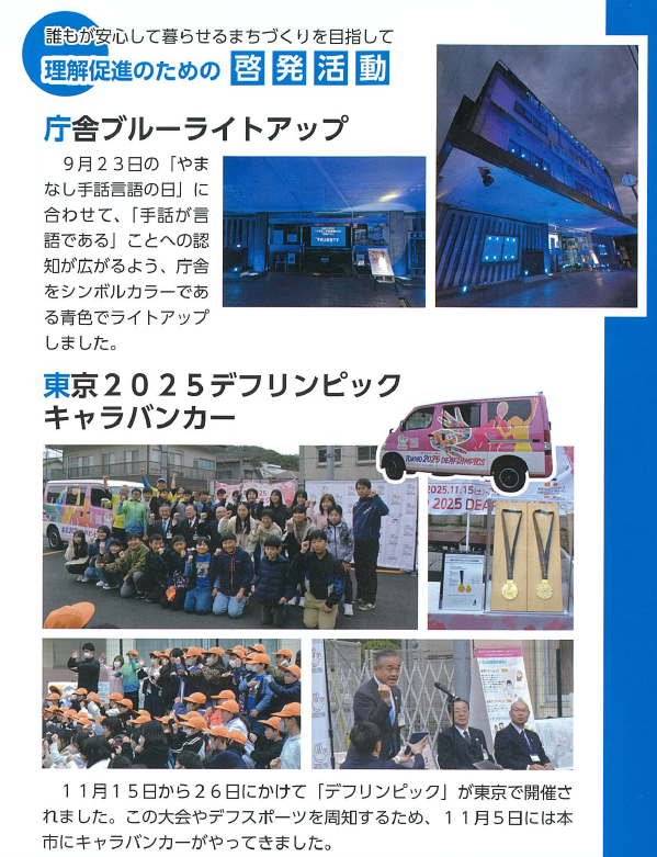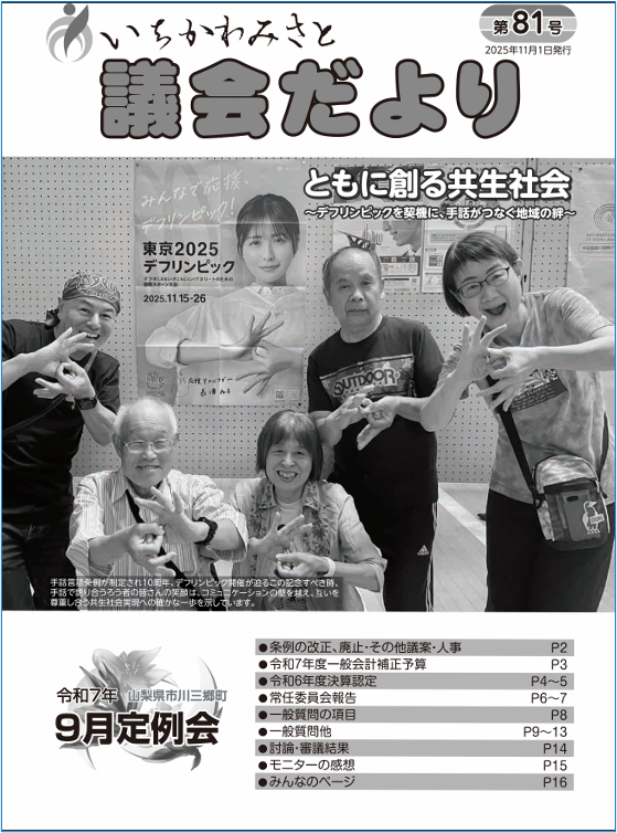 <右の議会広報表紙> 11月15日から東京で開催されるデフリンピックを契機に、市川三郷町聴覚障害者協会がより手話への関心を高めるため、「デフリンピック」という手話表現をしています。協会の皆さんのうれしい笑顔をとらえた表紙写真です。この表紙掲載で、町民の皆さんに親しまれてデフリンピックのことをより身近に感じていただけると思います。ありがとうございます。