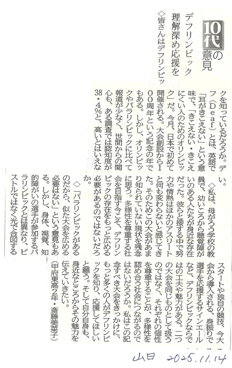 11月15日から東京デフリンピックがいよいよ開催されますが、選手たちの活躍はもちろんですが、障害の有無にかかわらず、互いの違いを認め合いながら、共にスポーツを楽しみ、尊重し合う社会づくりへの理解を深めるとても貴重な機会となります。