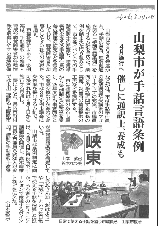 208. 山梨市では、「手話は言語である」との考えのもと、手話への理解と普及を図ることを目指す「山梨市手話言語条例」の制定に向けて協議を進めています。山梨市聴覚障害者協会・手話サークル関係者が「やっと成立して、とてもうれしい。手話言語を理解する人が増えてほしい」と喜んでいます。