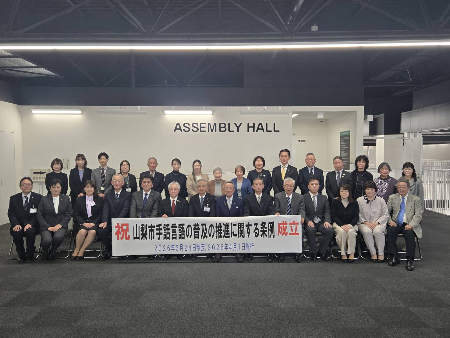 210.令和8年3月24日、山梨市議会定例会におきまして、山梨市手話言語の普及の推進に関する条例が全会一致で可決し、成立しました。議決の日には、聴覚障害者協会の方をはじめ、手話通訳者や手話サークルなど関係者の方の32名が傍聴にいらっしゃいました。